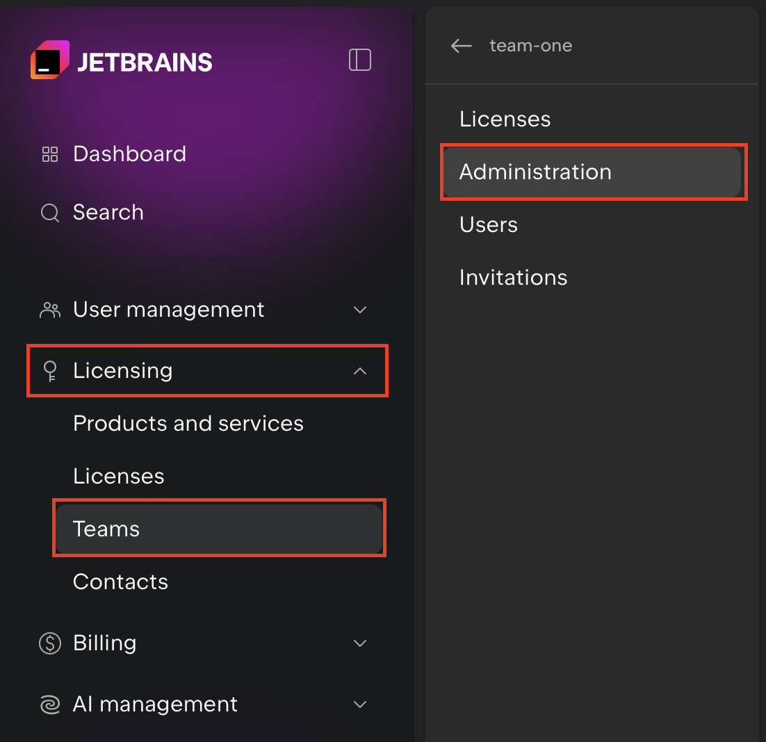 現在のオーガニゼーション管理者またはチーム管理者が JetBrains Console の左側のメニュー一覧より Licensing の Teams をクリックし、該当のチームを選択した状態で Administration メニューをクリックします。
