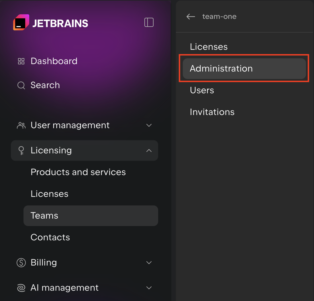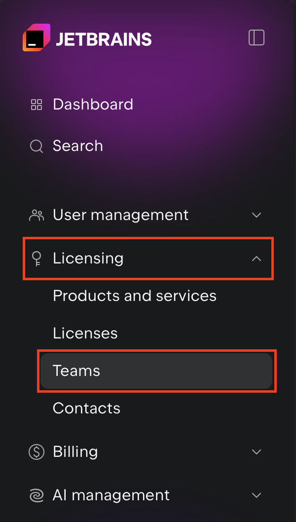 - JetBrains Console の左側のメニュー一覧より Licensing の Teams を選択します。