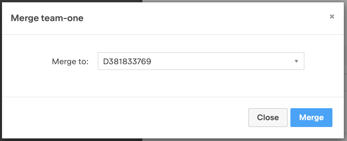 - ダイアログが現れたらプルダウンリストよりマージ先のチームを選択し、Merge ボタンをクリックします。