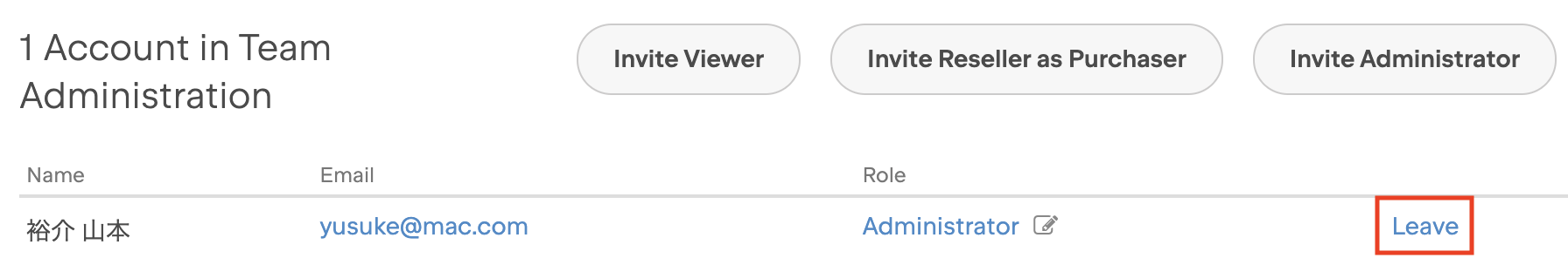 - (n) Accounts in Team Administration ((n)はチーム管理者に割り当てられている人数)セクションにて、ご自身の権限を取り消す場合は管理者リストの中から自分を探しだし、その右側にある Leave をクリックします。