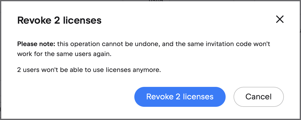 - 注意事項が表示されます。問題なければ Revoke n license(s) ボタンを押下します