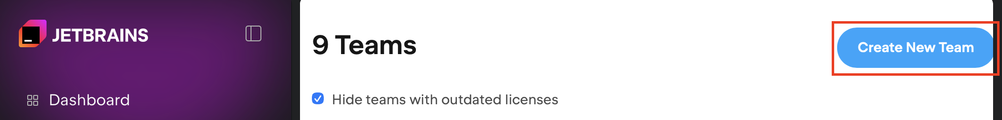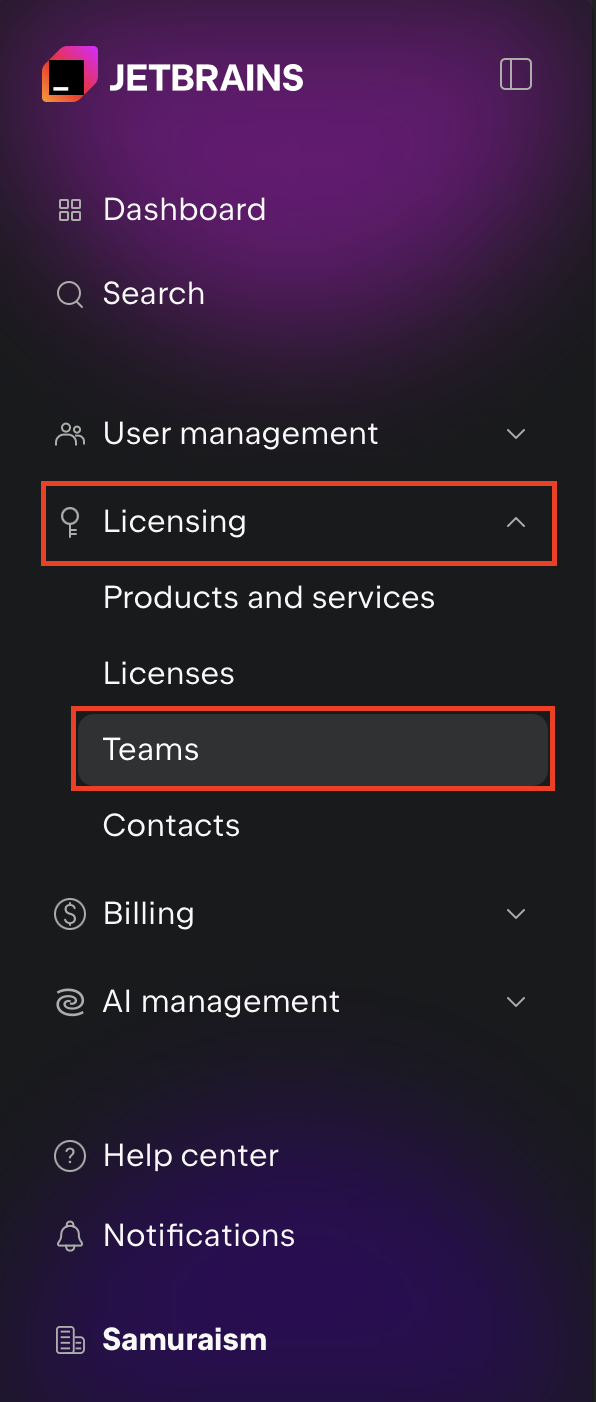 - JetBrains Console の左側のメニュー一覧より Licensing の Teams を選択します。